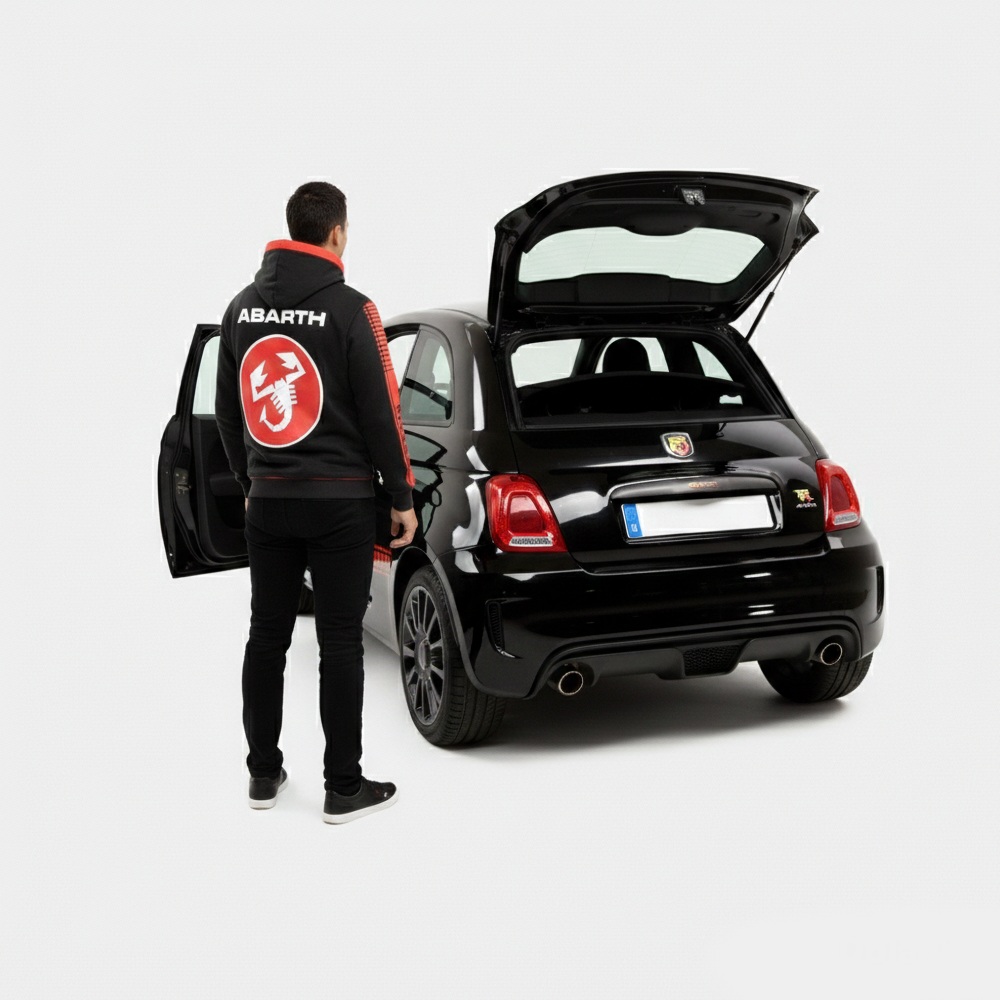 - Espalda: Ícono del escorpión Abarth en tamaño grande, símbolo de la potencia y la identidad de la marca