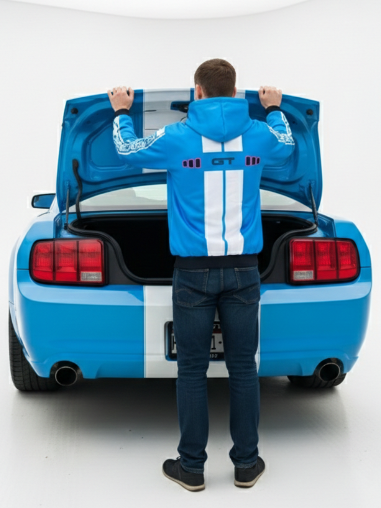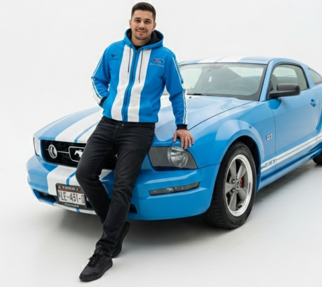 Diseñada específicamente para los verdaderos entusiastas del automovilismo y la velocidad, esta prenda rinde homenaje a la icónica estética del Mustang de quinta y sexta generación.
